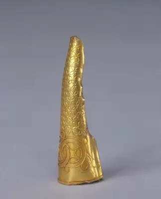 A gold carved fingernail sheath, 5.2 cm long, from the Palace Museum's collection. [Photo/Official Wechat account of Palace Museum's Taobao]