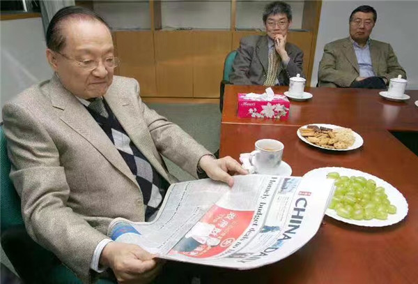 Louis Cha (left) at the office of China Daily Hong Kong Edition in March 2005. [Edmond Tang / China Daily]