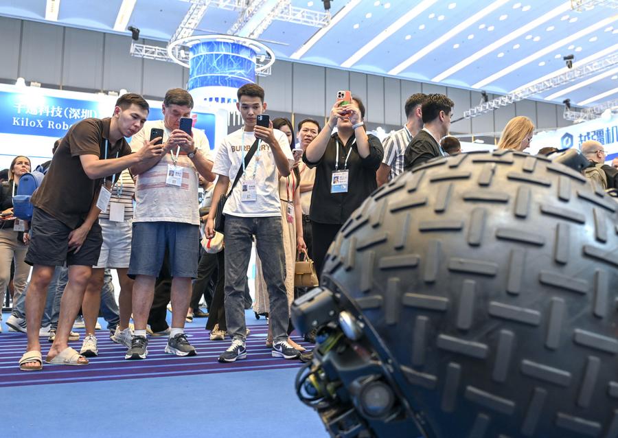 Visitors view a spherical patrol robot at the booth of Magiclab Robotics Technology Co., Ltd. at the Service Robots Zone during the 138th edition of the China Import and Export Fair (Canton Fair) in Guangzhou, south China's Guangdong Province, Oct. 15, 2025. (Xinhua/Xiao Ennan)