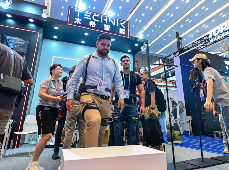 A foreign purchaser tries an exoskeleton robot for mountain climbing at the booth of Hangzhou Technik Technology Co., Ltd. at the Service Robots Zone during the 138th edition of the China Import and Export Fair (Canton Fair) in Guangzhou, south China's Guangdong Province, Oct. 15, 2025. (Xinhua/Xiao Ennan)