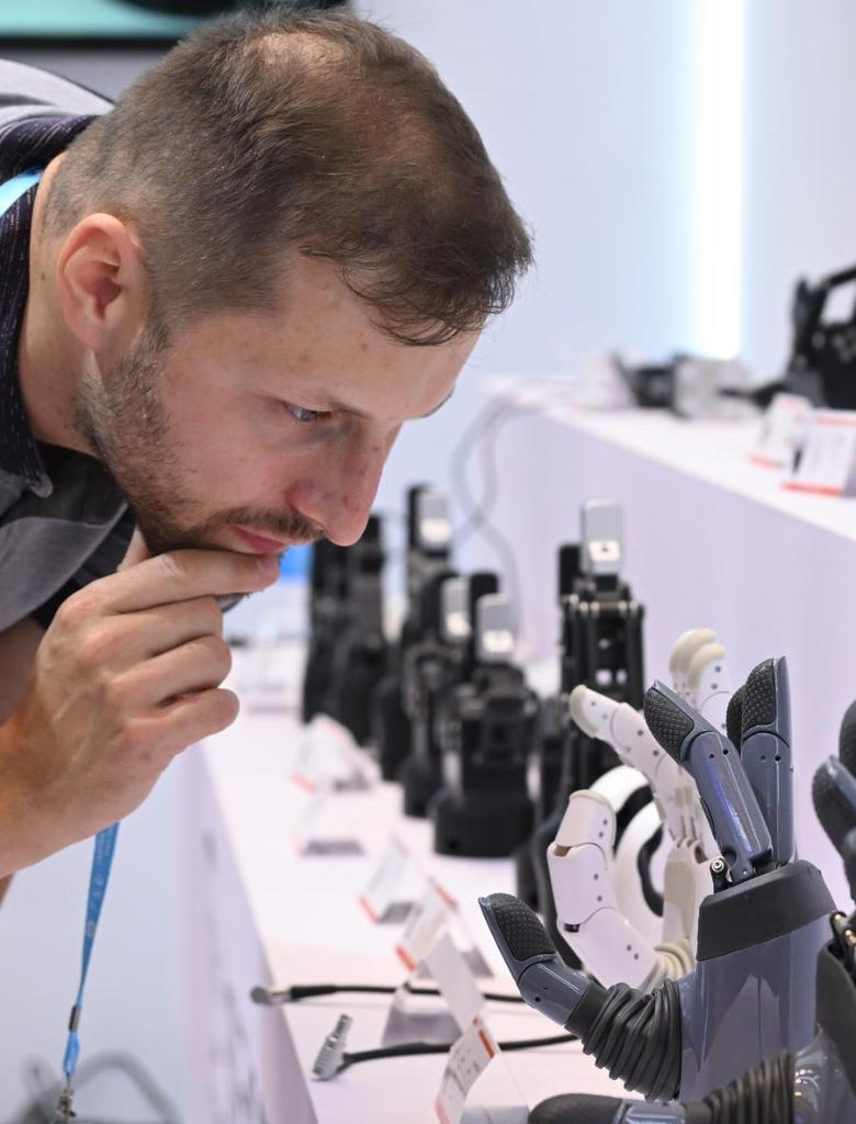 Foreign purchasers interact with robotic hands at the Service Robots Zone during the 138th edition of the China Import and Export Fair (Canton Fair) in Guangzhou, south China's Guangdong Province, Oct. 15, 2025. (Xinhua/Deng Hua)