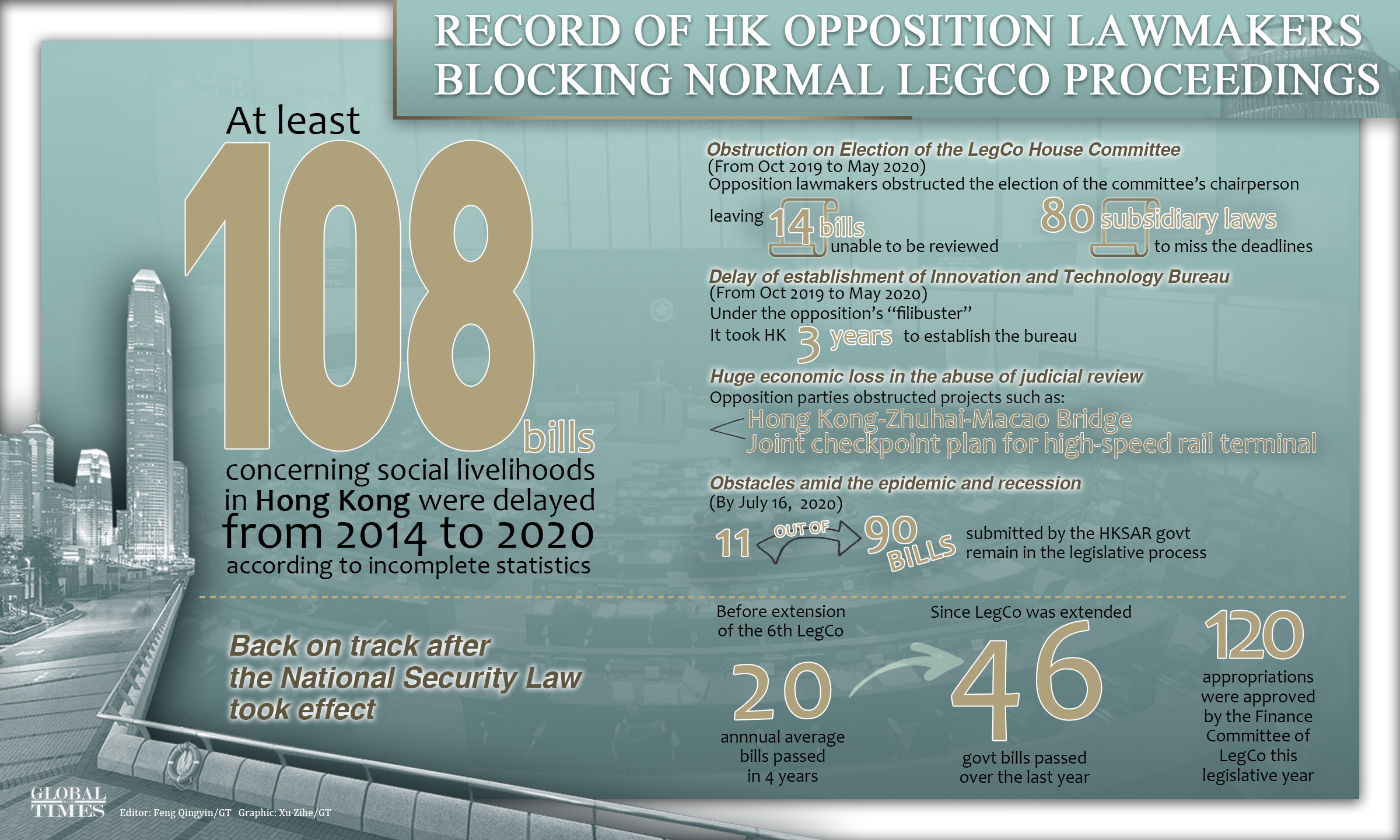 The Global Times discovered that at least 108 bills on livelihood, including medical, traffic, elderly care, and local infrastructure projects were delayed between 2014 and 2020, according to incomplete statistics, due to filibustering and other tools designed by opposition lawmakers to bring dysfunction to the LegCo.