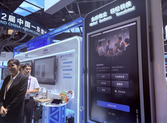 The exhibition booth of iFLYTEK shows its translation product supporting ASEAN countries' languages in Nanning on Sept.19, 2025.