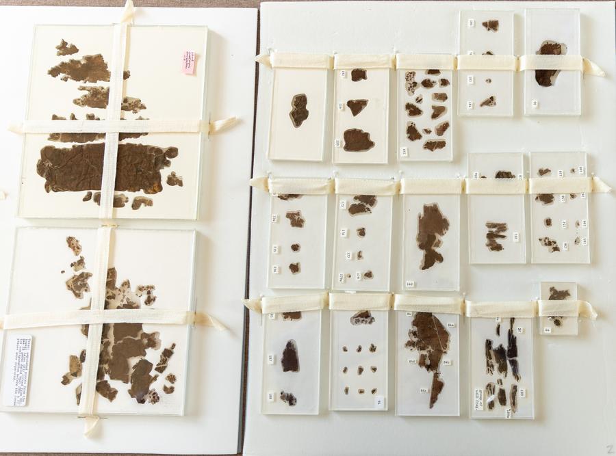 The ancient Zidanku Silk Manuscripts from the Warring States period are displayed during a handover ceremony at the Chinese Embassy in the United States in Washington, D.C., May 16, 2025. (Xinhua/Hu Yousong)
