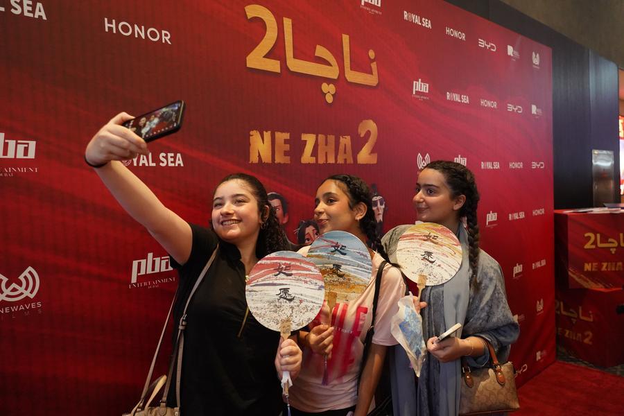 Girls take a selfie in front of a promotional display for the premiere of Chinese animated blockbuster "Ne Zha 2" in Riyadh, Saudi Arabia on June 25, 2025. (Xinhua/Luo Chen)