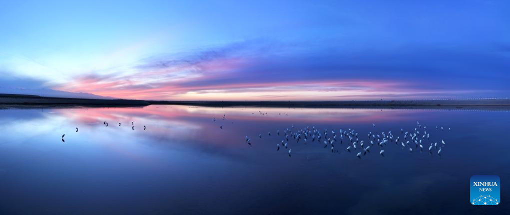 A drone photo shows egrets foraging at a reservoir in the Kazak Autonomous County of Aksay in northwest China's Gansu Province, Nov. 9, 2025. (Photo by Gao Hongshan/Xinhua)