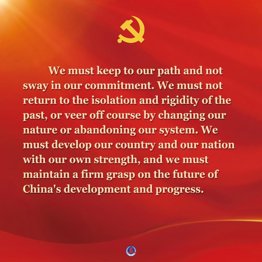 -- We must keep to our path and not sway in our commitment. We must not return to the isolation and rigidity of the past, or veer off course by changing our nature or abandoning our system. We must develop our country and our nation with our own strength, and we must maintain a firm grasp on the future of China's development and progress.