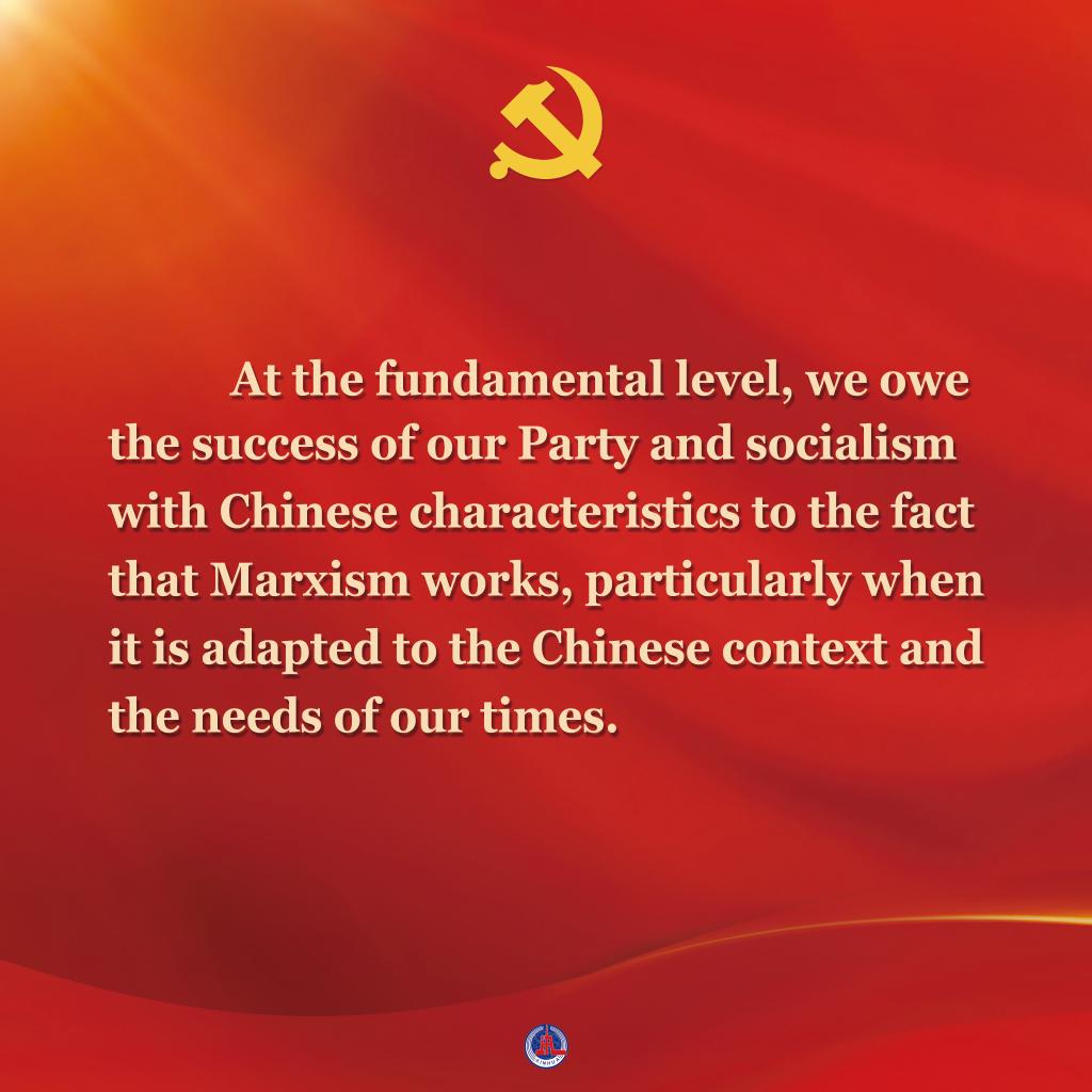 -- At the fundamental level, we owe the success of our Party and socialism with Chinese characteristics to the fact that Marxism works, particularly when it is adapted to the Chinese context and the needs of our times.