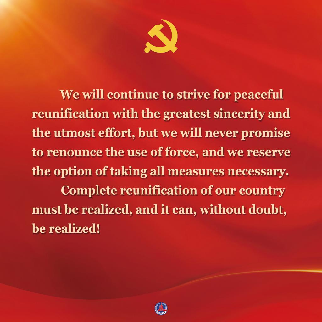 -- We will continue to strive for peaceful reunification with the greatest sincerity and the utmost effort, but we will never promise to renounce the use of force, and we reserve the option of taking all measures necessary.