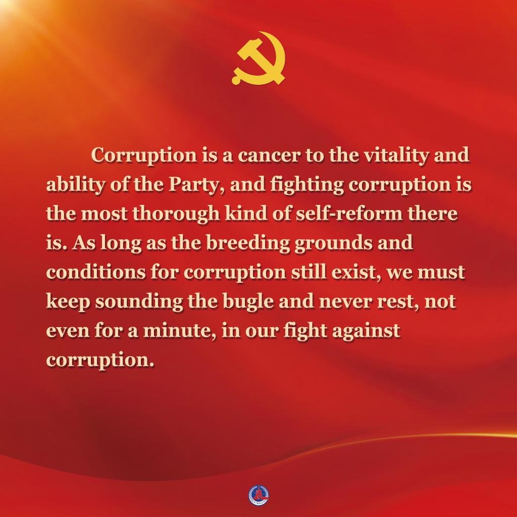 -- Corruption is a cancer to the vitality and ability of the Party, and fighting corruption is the most thorough kind of self-reform there is. As long as the breeding grounds and conditions for corruption still exist, we must keep sounding the bugle and never rest, not even for a minute, in our fight against corruption.