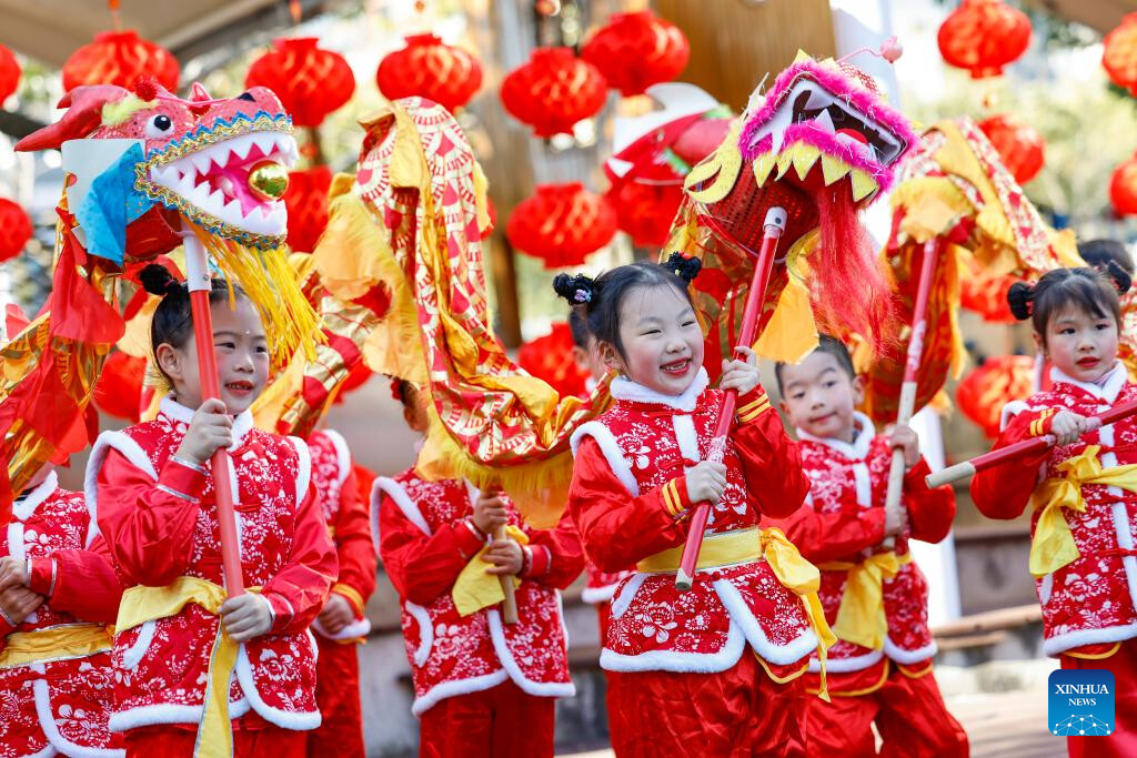 Children try dragon dance at a kindergarten in Huangshan City, east China's Anhui Province, Jan. 17, 2025. Various activities were held across the country to welcome the upcoming Chinese New Year, or Spring Festival, which falls on Jan. 29 this year. (Photo by Shi Yalei/Xinhua)