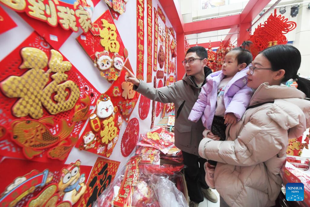 A customer selects Spring Festival decorations at a market in Tengzhou City, east China's Shandong Province, Jan. 17, 2025. Various activities were held across the country to welcome the upcoming Chinese New Year, or Spring Festival, which falls on Jan. 29 this year. (Photo by Li Zhijun/Xinhua)