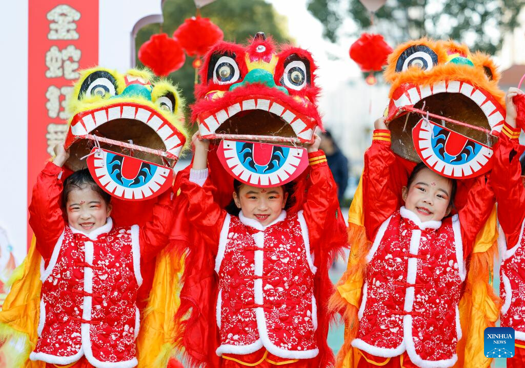 People perform dragon dance during an event celebrating the upcoming Spring Festival at Caijie Village in Huzhou City, east China's Zhejiang Province, Jan. 18, 2025. Various activities were held across the country to welcome the upcoming Chinese New Year, or Spring Festival, which falls on Jan. 29 this year. (Photo by Yao Haixiang/Xinhua)