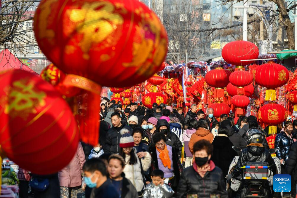 Citizens shop for the upcoming Spring Festival at a market in north China's Tianjin, Jan. 18, 2025. Various activities were held across the country to welcome the upcoming Chinese New Year, or Spring Festival, which falls on Jan. 29 this year. (Photo by Du Penghui/Xinhua)