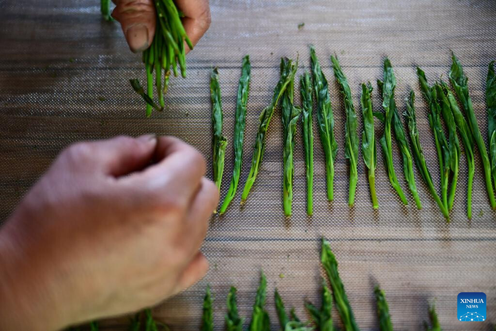 A worker processes tea leaves in Houkeng Village of Huangshan, east China's Anhui Province, April 15, 2025.