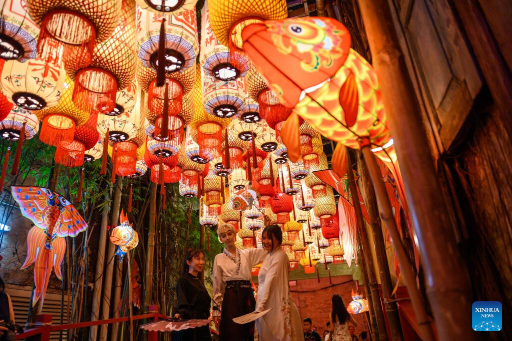People pose for photos with lanterns in Kuala Lumpur, Malaysia, Jan. 18, 2025. Celebrations and cultural activities are being held around the globe to welcome the upcoming Chinese New Year. (Xinhua/Chong Voon Chung)