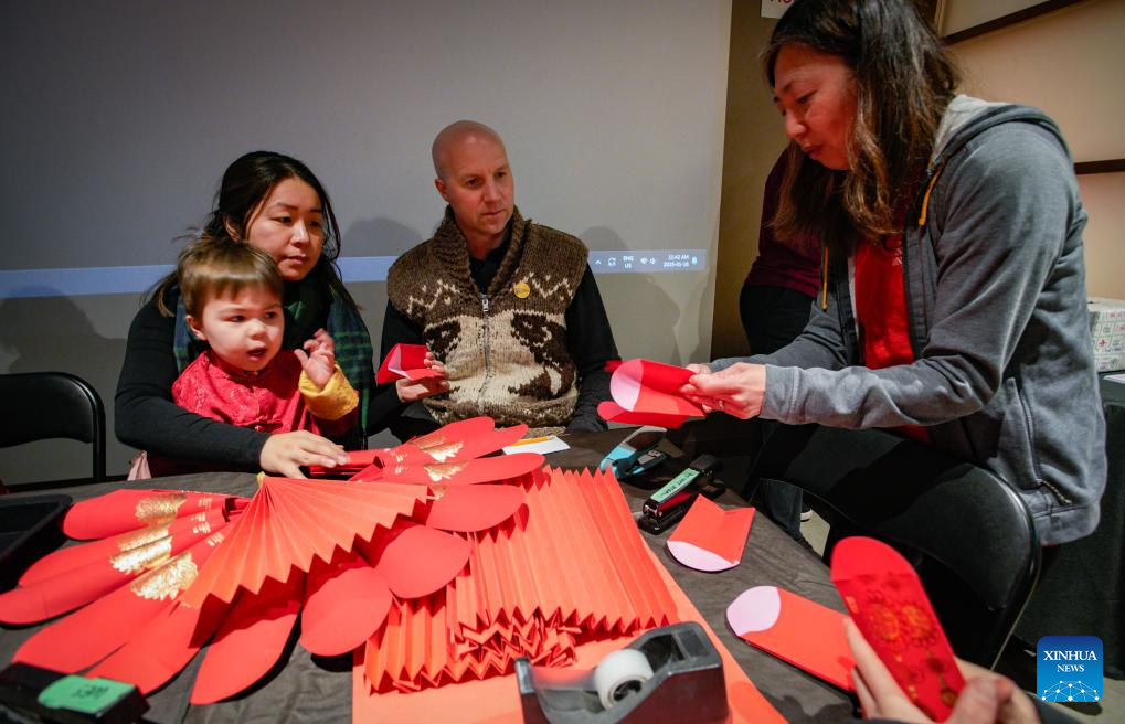 People learn to make Chinese New Year decorations using red packets at a craft workshop in Vancouver, British Columbia, Canada, Jan. 18, 2025. Celebrations and cultural activities are being held around the globe to welcome the upcoming Chinese New Year. (Photo by Liang Sen/Xinhua)