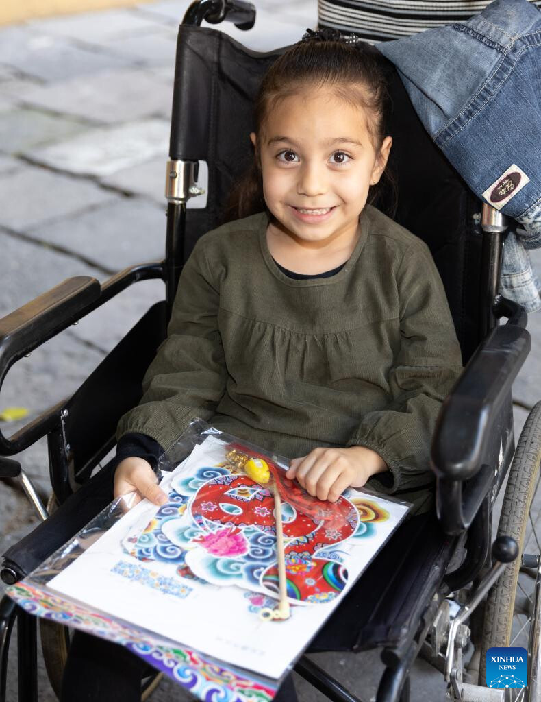 A girl receives Spring Festival decorations during the 11th "China in My Imagination" children's painting contest in Mexico City, Mexico, Jan. 18, 2025. Celebrations and cultural activities are being held around the globe to welcome the upcoming Chinese New Year. (Xinhua/Li Mengxin)