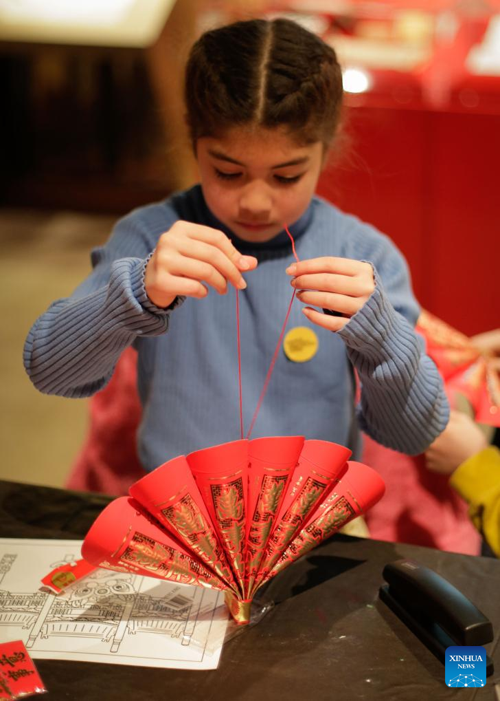 A girl creates a Chinese New Year decoration using red packets at a craft workshop in Vancouver, British Columbia, Canada, Jan. 18, 2025. Celebrations and cultural activities are being held around the globe to welcome the upcoming Chinese New Year. (Photo by Liang Sen/Xinhua)