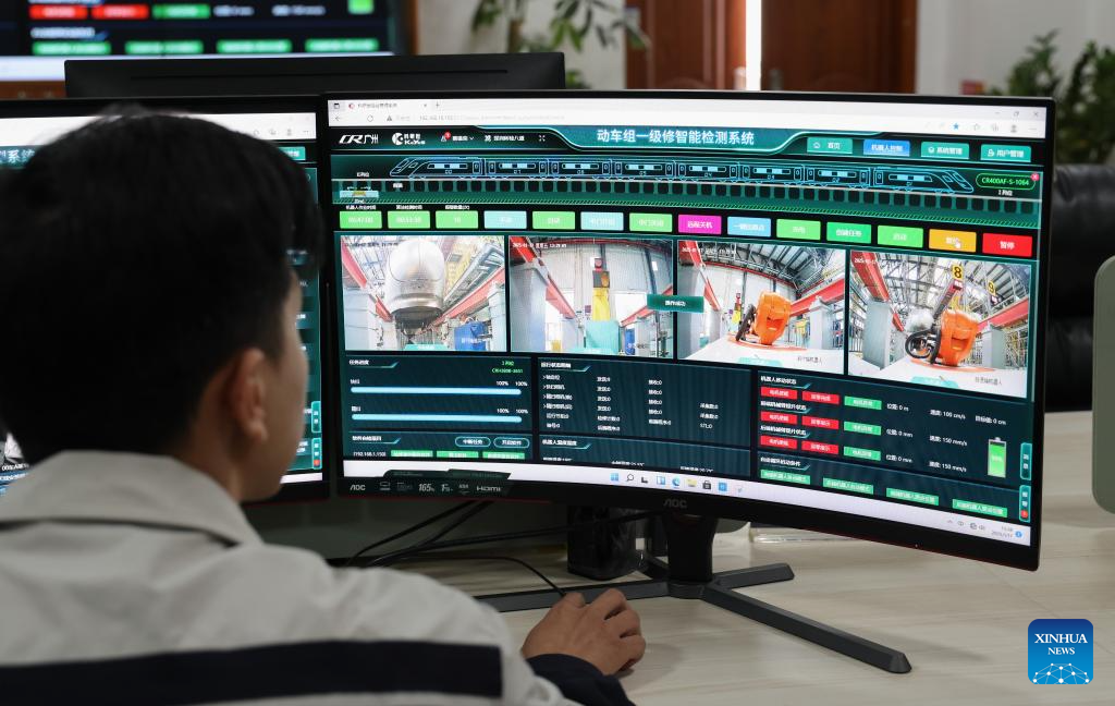 A maintenance staff inspects a high-speed sleeper train remotely with an intelligent car bottom robot at a high-speed train depot in Shenzhen, south China's Guangdong Province, Jan. 17, 2025. Intelligent car-bottom robots, self-service car washes, intelligent tool rooms, etc., are used for the maintenance of high-speed sleeper trains in Shenzhen high-speed train depot during the Spring Festival travel rush. (Xinhua/Mao Siqian)