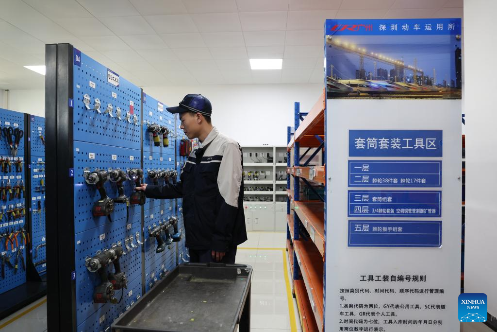A maintenance staff selects tools at a intelligent tool room at a high-speed train depot in Shenzhen, south China's Guangdong Province, Jan. 17, 2025. Intelligent car-bottom robots, self-service car washes, intelligent tool rooms, etc., are used for the maintenance of high-speed sleeper trains in Shenzhen high-speed train depot during the Spring Festival travel rush. (Xinhua/Mao Siqian)
