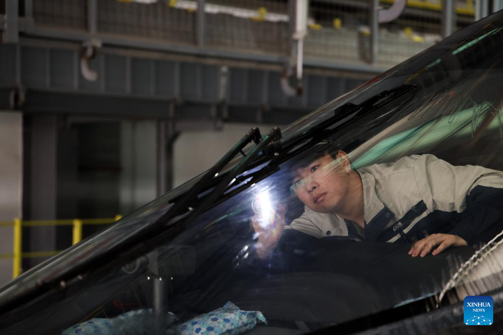 A maintenance staff inspects the cab of a high-speed sleeper train at a high-speed train depot in Shenzhen, south China's Guangdong Province, Jan. 17, 2025. Intelligent car-bottom robots, self-service car washes, intelligent tool rooms, etc., are used for the maintenance of high-speed sleeper trains in Shenzhen high-speed train depot during the Spring Festival travel rush. (Xinhua/Mao Siqian)
