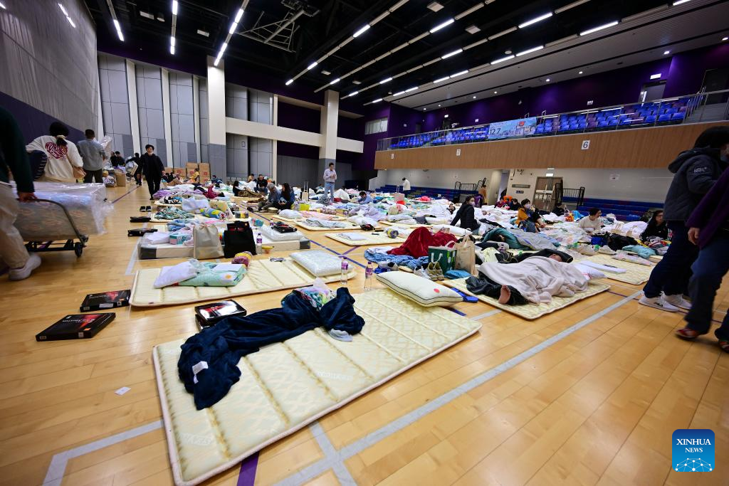 This photo shows an interior view of a temporary shelter near a residential area fire site in Hong Kong, south China, Nov. 27, 2025. (Xinhua/Zhu Wei)