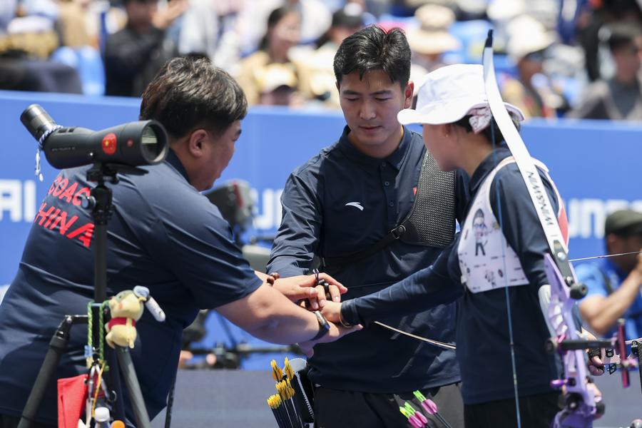 Wang Yan (C) and Li Jiaman (R) of China cheer up with their coach during the gold final of the Recurve Mixed Team competition, May 11, 2025. (Xinhua/Wang Xiang)