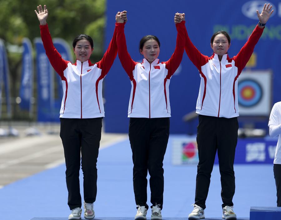 (L to R) Silver medalists Huang Yuwei, Li Jiaman and Zhu Jingyi of China celebrate during the award ceremony for the Recurve Women's Team competition, May 11, 2025. (Xinhua/Wang Xiang)