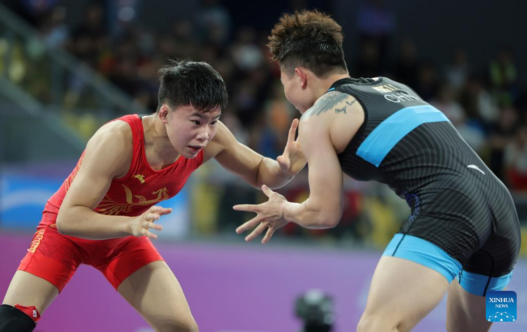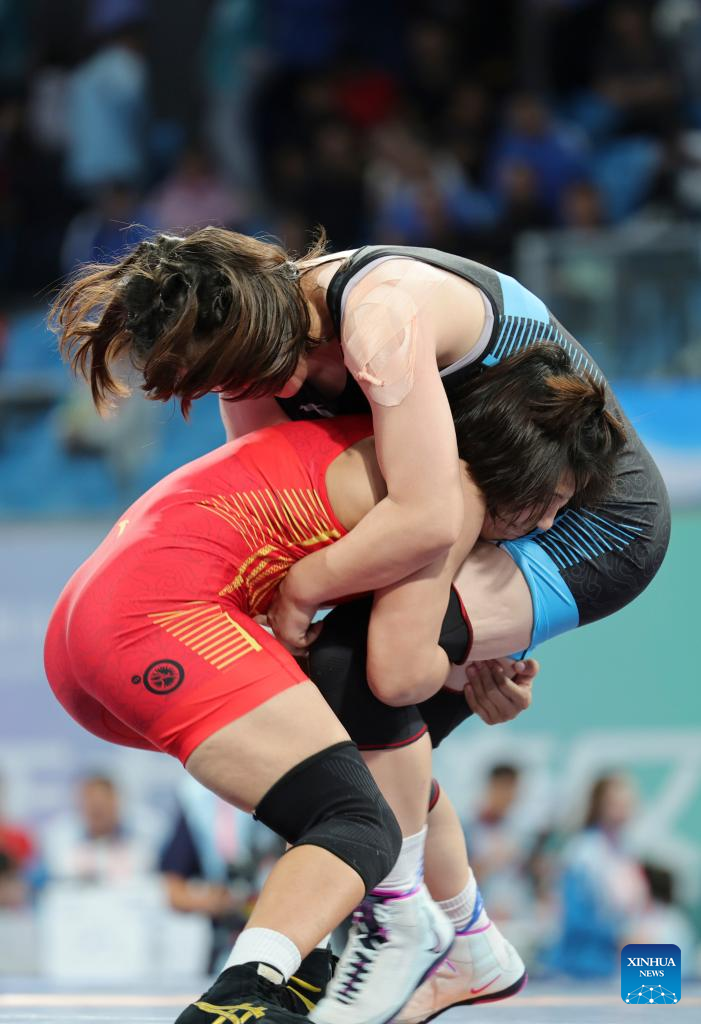 Zhang Jin (L) of Jiangsu competes against Pang Qianyu of Hunan during the women's freestyle 53kg final match of wrestling at China's 15th National Games in Qingyuan, south China's Guangdong Province, Nov. 10, 2025. (Xinhua/Li Ran)
