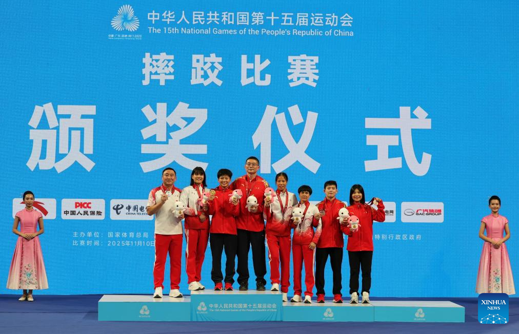 Gold medalist Zhang Jin of Jiangsu, silver medalist Pang Qianyu of Hunan, bronze medalist Luo Lannuan of Guangdong and bronze medalist Li Yuxuan of Guangxi pose for group photos with their coaches during the awarding ceremony for the women's freestyle 53kg of wrestling at China's 15th National Games in Qingyuan, south China's Guangdong Province, Nov. 10, 2025. (Xinhua/Li Ran)