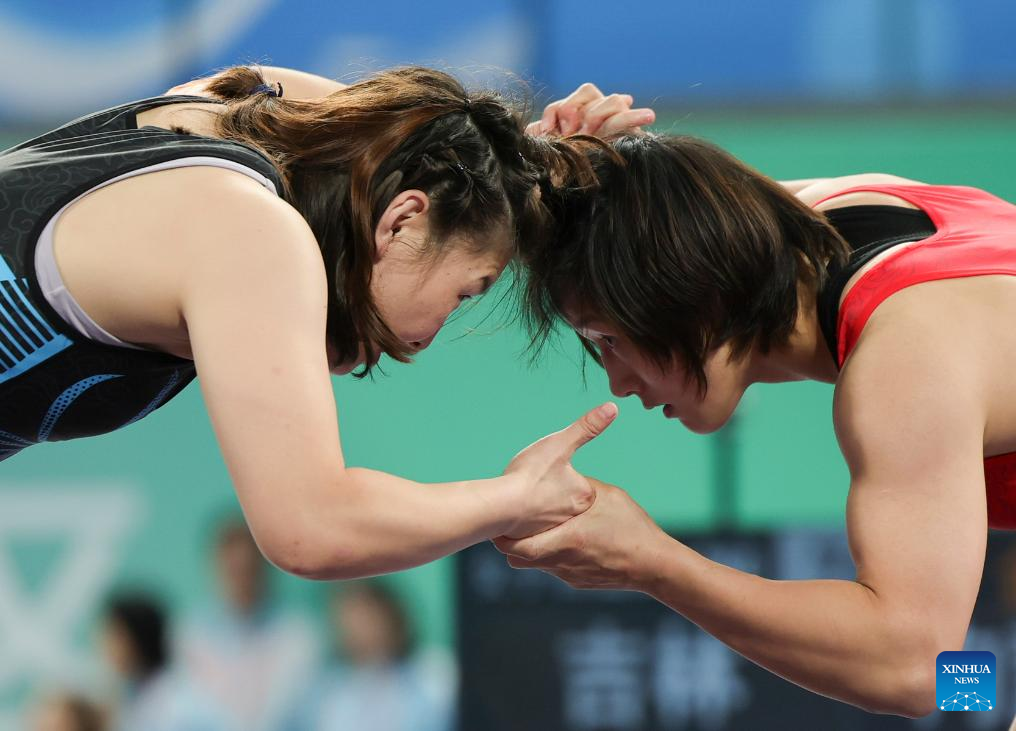Zhang Qi (R) of Jilin competes against Bao Lingling of Inner Mongolia during the women's freestyle 62kg final match of wrestling at China's 15th National Games in Qingyuan, south China's Guangdong Province, Nov. 10, 2025. (Xinhua/Li Ran)