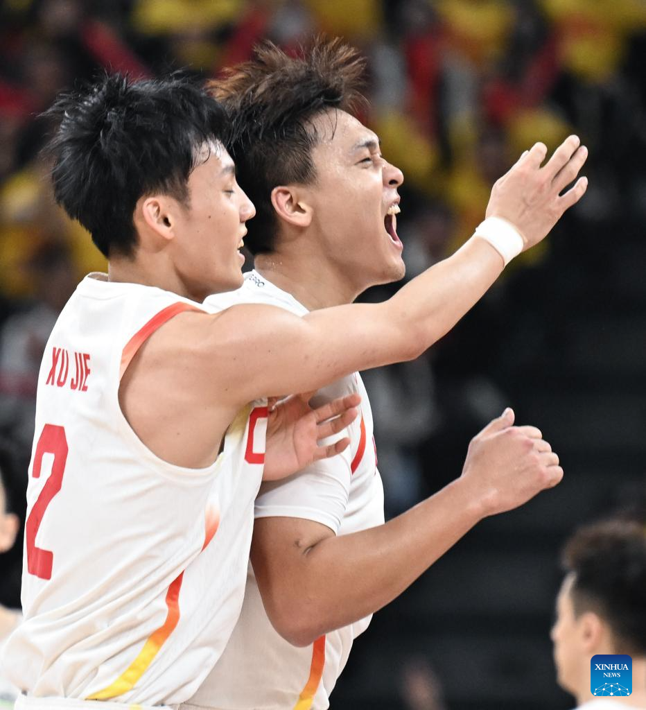 Xu Jie (L) and Zhao Rui of China celebrate during the FIBA Asia Cup 2025 Qualifiers Group C match between China and Japan in Shenzhen, south China's Guangdong Province, Feb. 20, 2025. (Xinhua/Deng Hua)