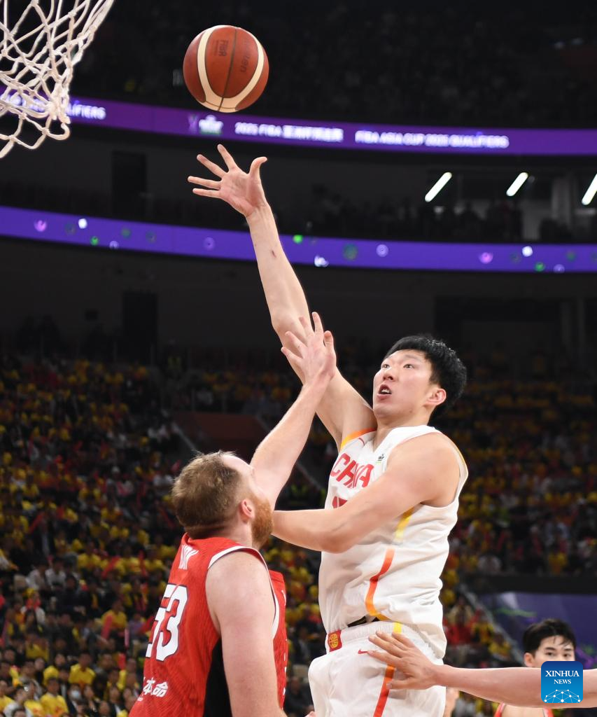 Zhou Qi (R) of China goes for a lay-up during the FIBA Asia Cup 2025 Qualifiers Group C match between China and Japan in Shenzhen, south China's Guangdong Province, Feb. 20, 2025. (Xinhua/Deng Hua)