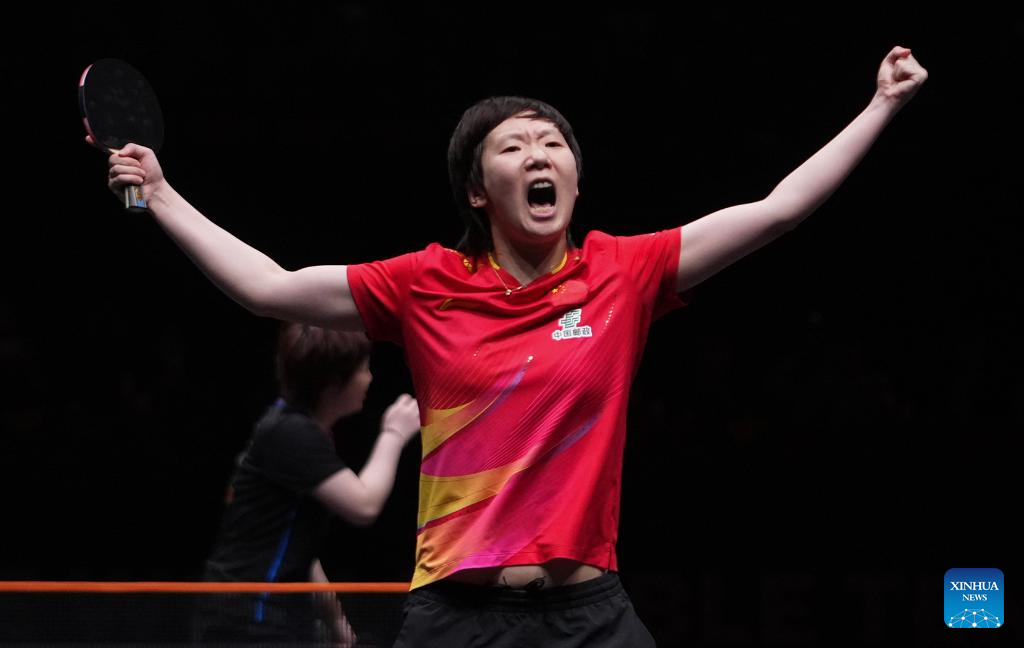 Wang Manyu celebrates after the women's singles final between Wang Manyu of China and Kuai Man of China at the WTT Finals Hong Kong 2025 in Hong Kong, south China, Dec. 14, 2025. (Xinhua/Lui Siu Wai)