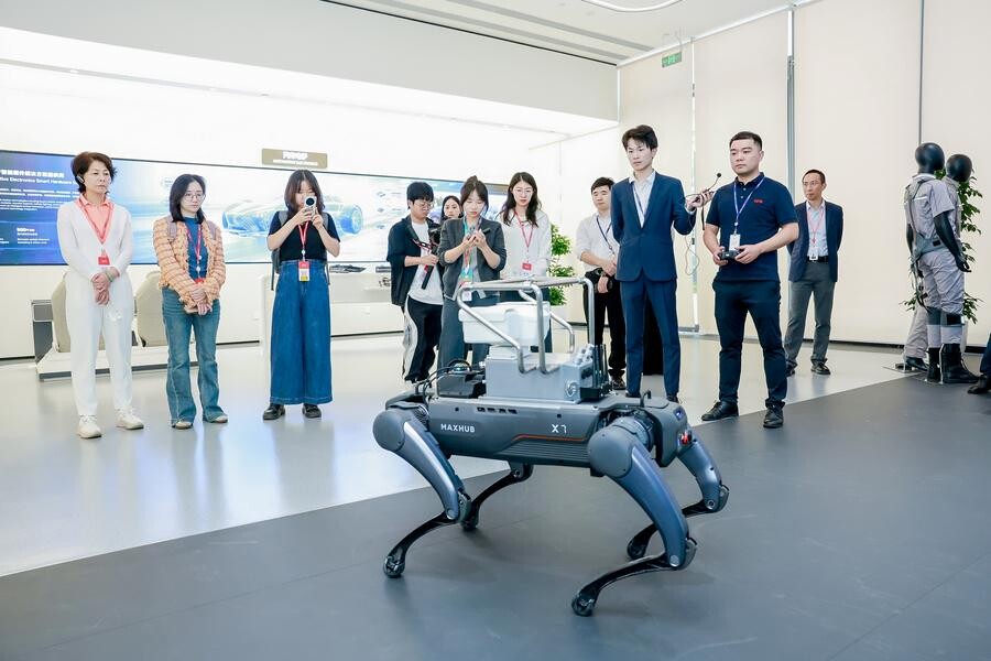 Inside, it showcases the latest products from more than 30 local tech firms. Humanoid robots play football, mechanical dogs haul cargo and drones perform mapping and delivery demonstrations.