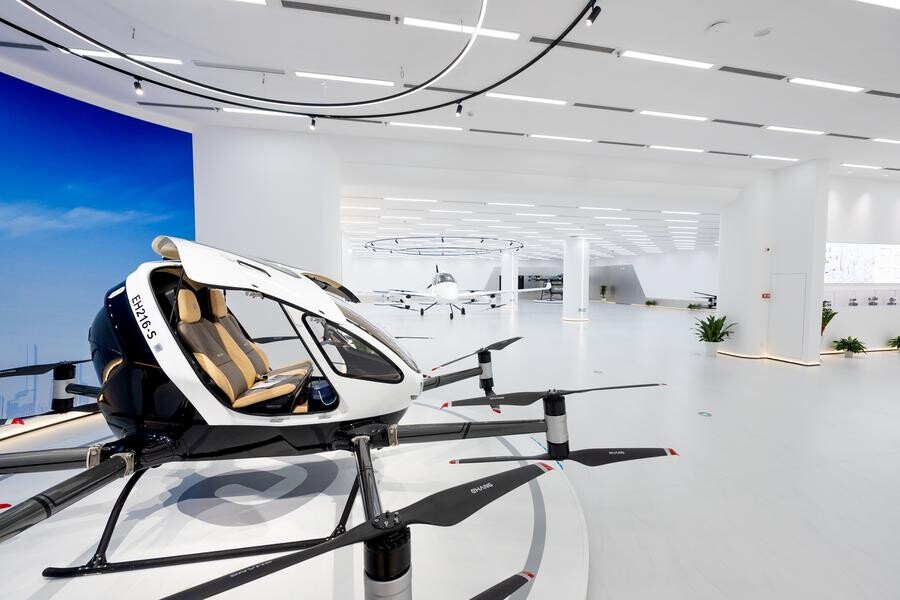 This photo, taken on Nov. 12, 2025, shows a manned flight vehicle in a smart exhibition center in Guangzhou. (Xinhua/He Leijing)
