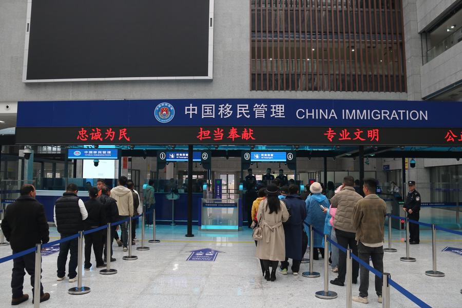 Passengers wait in line for entry and exit border inspection at the Dongzhong Port in Fangchenggang City, south China's Guangxi Zhuang Autonomous Region, Feb. 25, 2025. (Photo by Feng Guiyun/Xinhua)