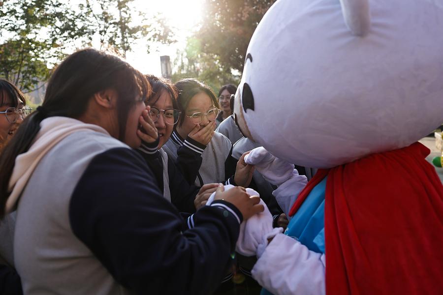 Students participate in an outdoor activity focusing on mental health at Zhangqiu No. 4 Middle School in Zhangqiu District of Jinan, east China's Shandong Province, Oct. 23, 2024. (Xinhua/Zhang Yuwei)