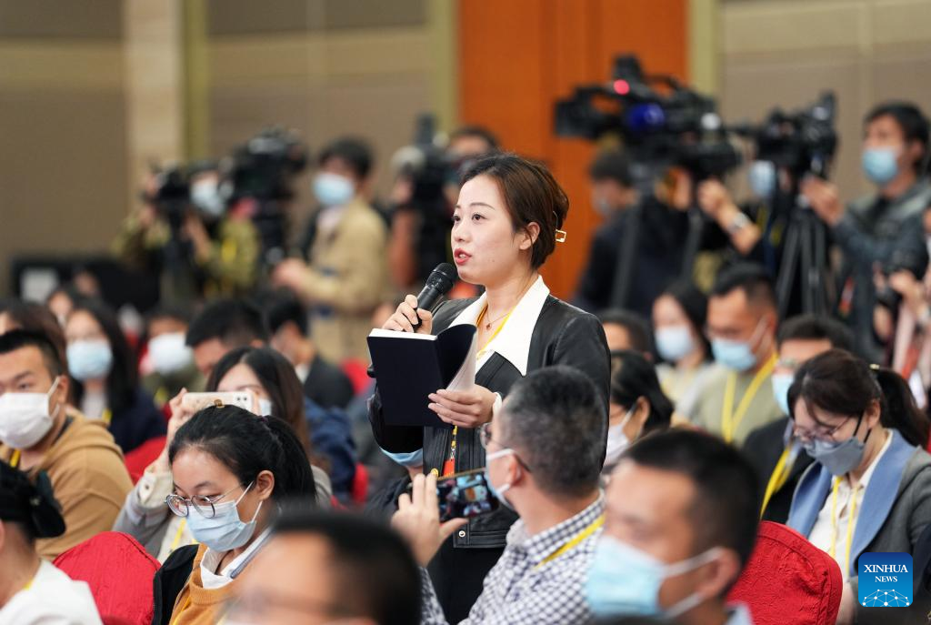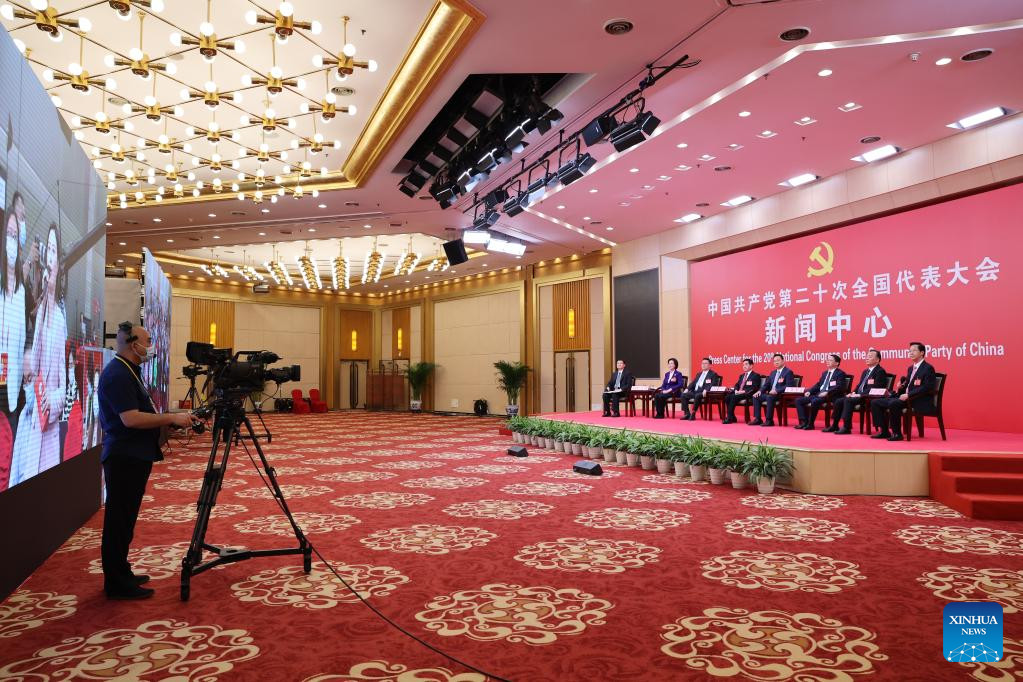 Journalists attend a group interview via video link in Beijing, Oct. 18, 2022. The press center for the 20th National Congress of the Communist Party of China (CPC) hosted its second group interview on Tuesday. During the interview, the spokespersons for delegations from Heilongjiang, Shanghai, Jiangsu, Zhejiang, Anhui, Fujian and Jiangxi to the 20th CPC National Congress introduced the delegations' study and discussion on the report to the 20th CPC National Congress, and answered questions from journalists. (Xinhua/Yin Gang)