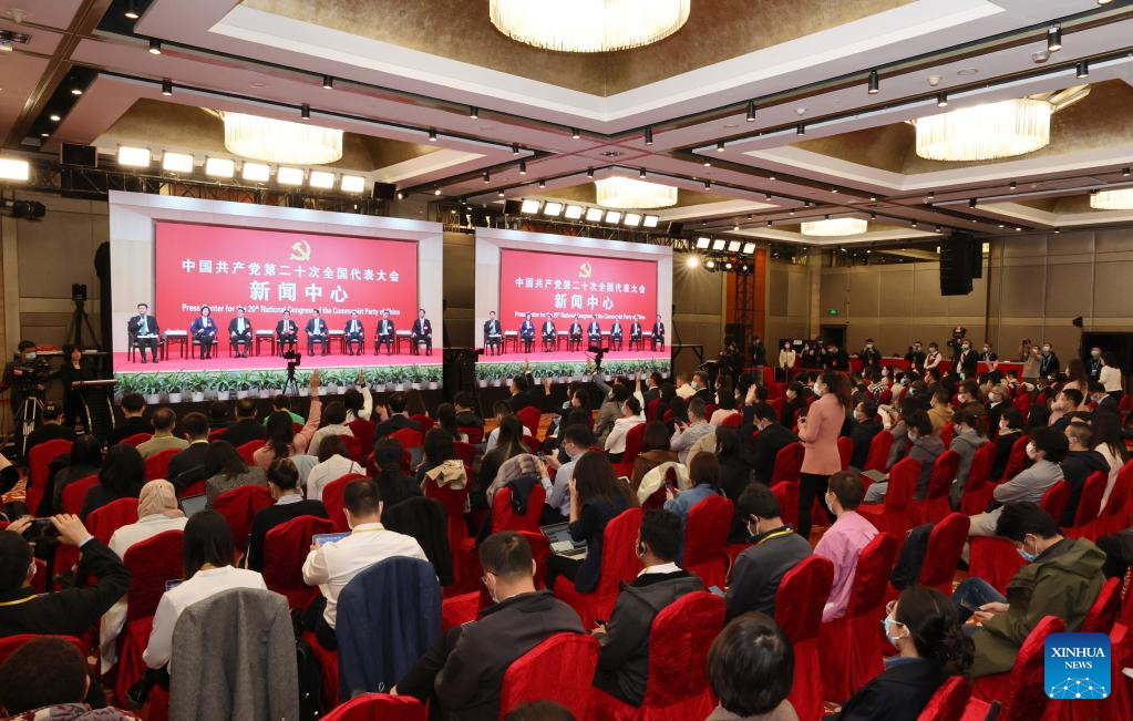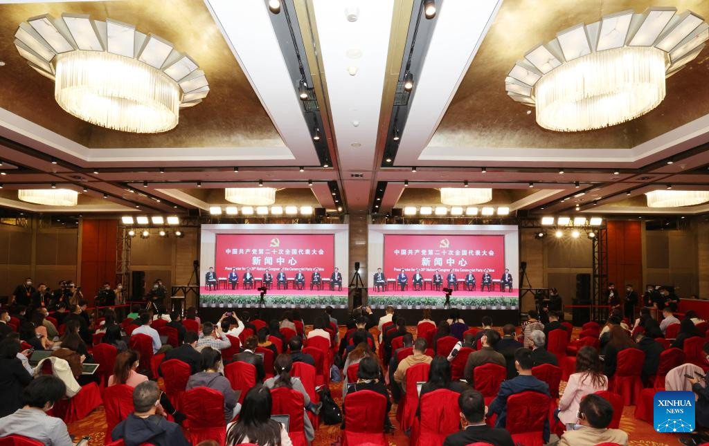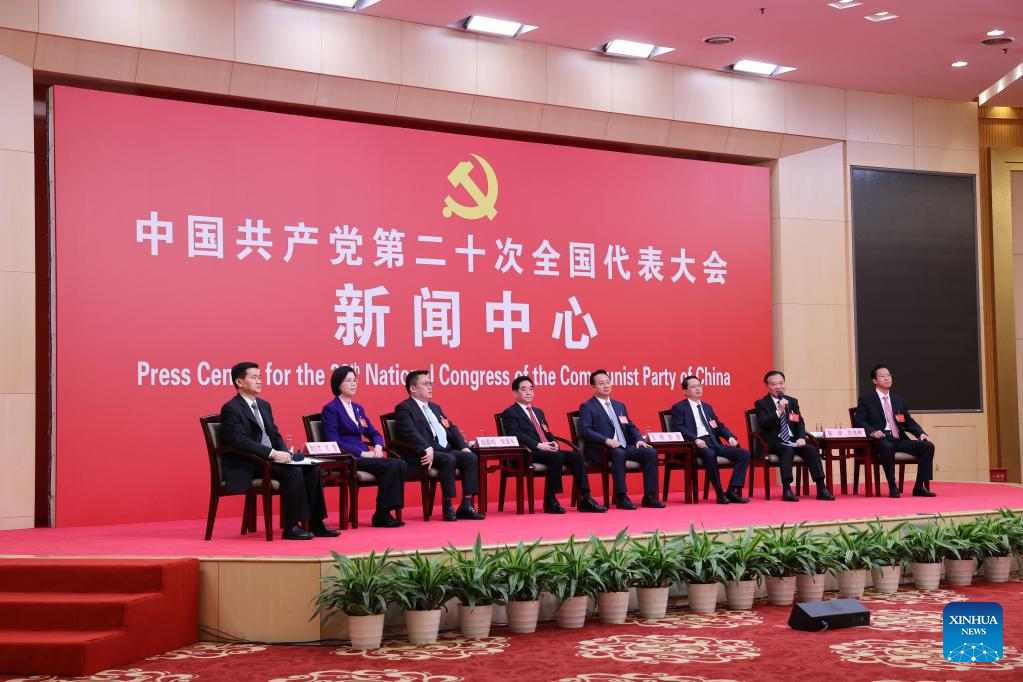 The spokespersons for delegations from Heilongjiang, Shanghai, Jiangsu, Zhejiang, Anhui, Fujian and Jiangxi to the 20th National Congress of the Communist Party of China (CPC) meet the press during a group interview in Beijing, Oct. 18, 2022. The press center for the 20th CPC National Congress hosted its second group interview on Tuesday. During the interview, the spokespersons introduced the delegations' study and discussion on the report to the 20th CPC National Congress, and answered questions from journalists. (Xinhua/Zhang Yuwei)
