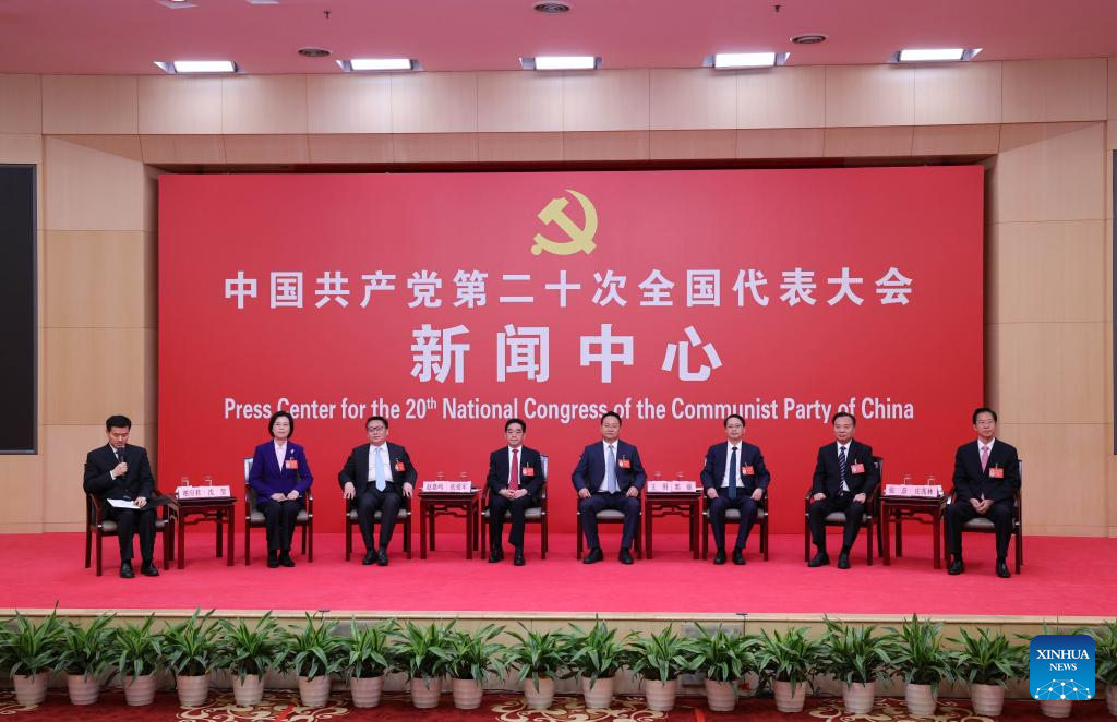 The spokespersons for delegations from Heilongjiang, Shanghai, Jiangsu, Zhejiang, Anhui, Fujian and Jiangxi to the 20th National Congress of the Communist Party of China (CPC) meet the press during a group interview in Beijing, Oct. 18, 2022. The press center for the 20th CPC National Congress hosted its second group interview on Tuesday. During the interview, the spokespersons introduced the delegations' study and discussion on the report to the 20th CPC National Congress, and answered questions from journalists. (Xinhua/Chen Jianli)