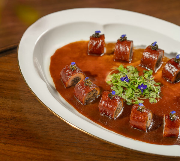 Precious mushroom roast goose roll at The Bay by Chef Fei. [Photo provided to chinadaily.com.cn]