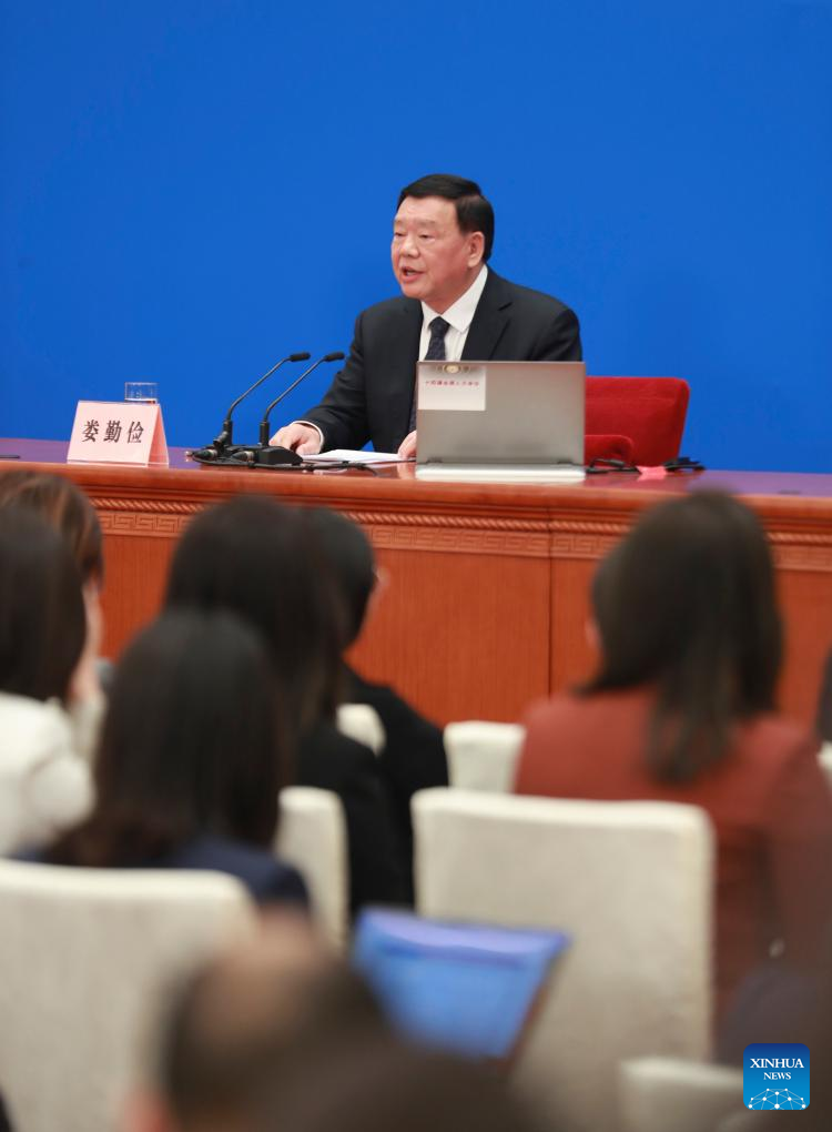 Lou Qinjian, spokesperson for the second session of the 14th National People's Congress (NPC), attends a press conference at the Great Hall of the People in Beijing, capital of China, March 4, 2024. The NPC, China's national legislature, held a press conference on Monday, one day ahead of the opening of its annual session. (Xinhua/Lu Ye)
