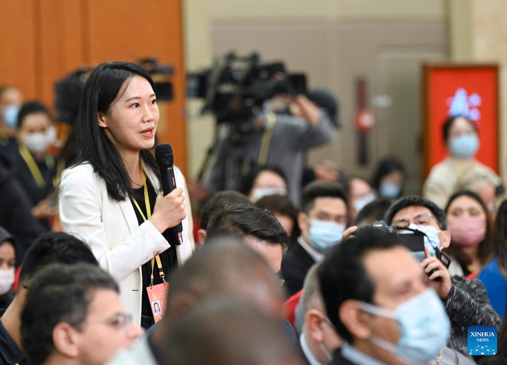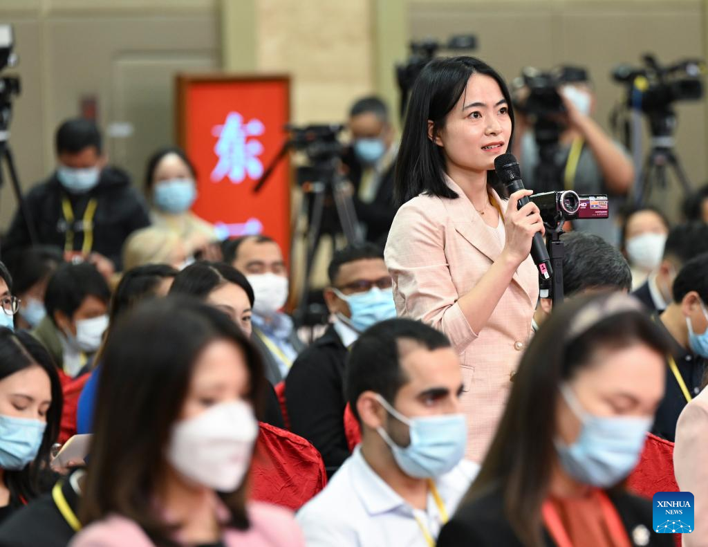 A journalist asks questions via video link during a press conference for the 20th National Congress of the Communist Party of China (CPC) in Beijing, capital of China, Oct. 15, 2022. The press conference was held by Sun Yeli, spokesperson for the 20th CPC National Congress, at the Great Hall of the People. (Xinhua/Jin Liangkuai)