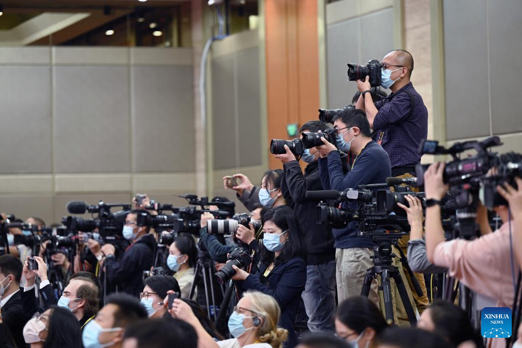 Photographers work at a press conference for the 20th National Congress of the Communist Party of China (CPC) in Beijing, capital of China, Oct. 15, 2022. The press conference was held via video link by Sun Yeli, spokesperson for the 20th CPC National Congress. (Xinhua/Jin Liangkuai)