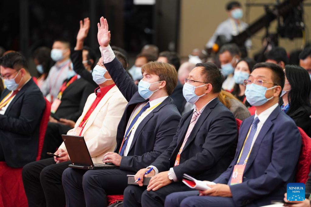 Journalists raise hands to ask questions via video link during a press conference for the 20th National Congress of the Communist Party of China (CPC) in Beijing, capital of China, Oct. 15, 2022. The press conference was held by Sun Yeli, spokesperson for the 20th CPC National Congress, at the Great Hall of the People. (Xinhua/Jin Liangkuai)
