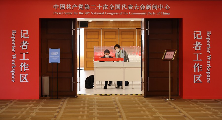 Photo taken on Oct. 12, 2022 shows the reporter workspace of the press center for the 20th National Congress of the Communist Party of China in Beijing, capital of China. (Xinhua/Yin Gang)