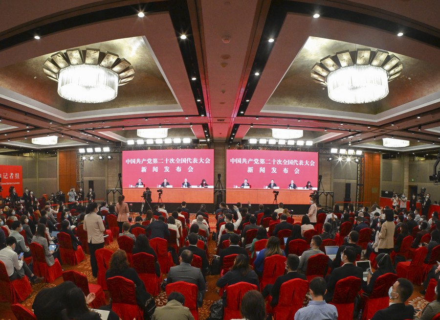 Journalists attend a press conference held by Sun Yeli, spokesperson for the 20th National Congress of the Communist Party of China, via video link in Beijing, capital of China, Oct. 15, 2022. (Xinhua/Chen Yehua)