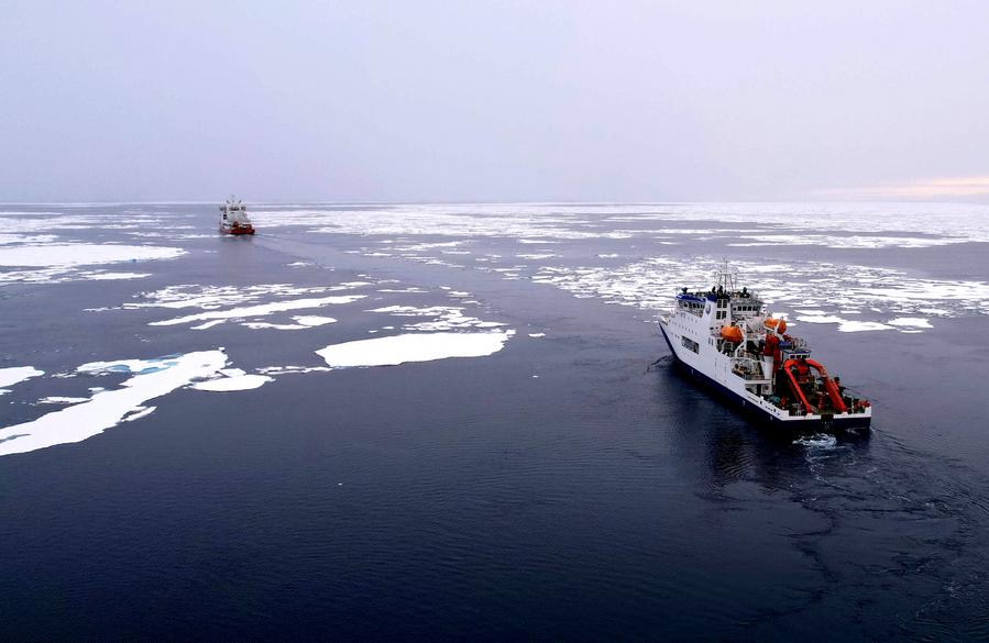 A drone photo taken on Aug. 5, 2025 shows China's research icebreaker Xuelong 2 breaking the ice to lead the way in the Arctic Ocean. (Xinhua/Liu Shiping)